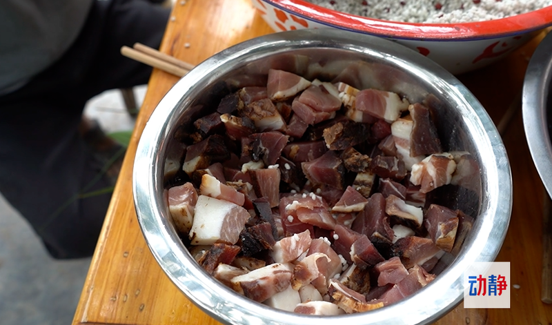 长大肥硕,两道捆索,四只角、形如枕头。这样的枕头粽,看起来并无什么太特别之处,但是里面内容也并非只有白糯米。饭豆,肉片,猪油,八角,草果,食盐等香料,再配上糯米,口感醇厚咸香,一口一个满足。