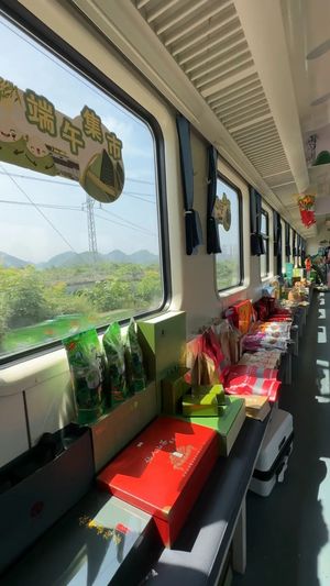 列车6号车厢,端午挂件挂满车厢顶棚,横跨行李架两端的“端午集市”格外醒目,端午窗贴粘满车窗,浓浓的粽叶香味扑面而来。而“集市车厢”里,沿线村民将自家种的粽叶、艾草、菖蒲、糯米、蔬菜等农产品整齐摆放,供乘车旅客选择购买。