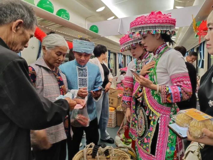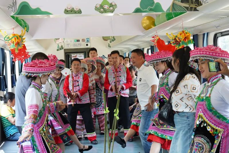 随着端午小长假的来临,成都、重庆、贵阳三大城市间乘坐慢火车出游打卡的市民及外地游客逐日增多,为了丰富旅客旅途时光,让旅客在旅途中感受到浓厚的节日氛围,中国铁路成都局集团有限公司、重庆铁路公安处、桐梓县文化旅游局联合在遵义开往重庆西的5630次列车上打造“端午集市”“民俗体验”车厢,供旅客在节日期间打卡游玩。