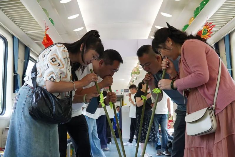 列车上不仅可以逛“集市”,在“民俗体验”车厢,旅客还可以欣赏民族特色舞蹈、古筝弹奏、吉他弹唱等节目,亲手制作粽子及艾草香包,体验中国的传统文化民俗。