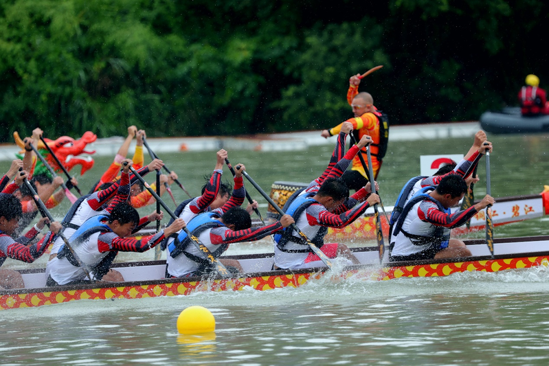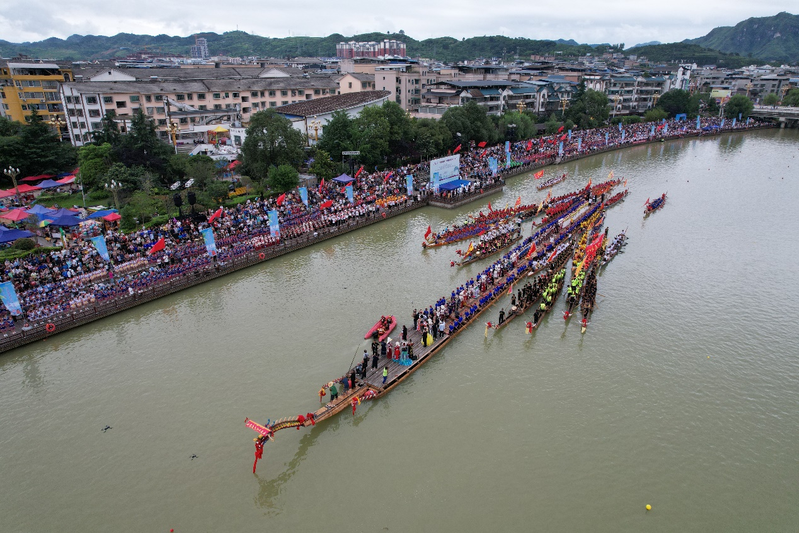 6月22日,当地2000余名壮汉抬着长达98.8米的木龙舟入江,场面声势浩大。