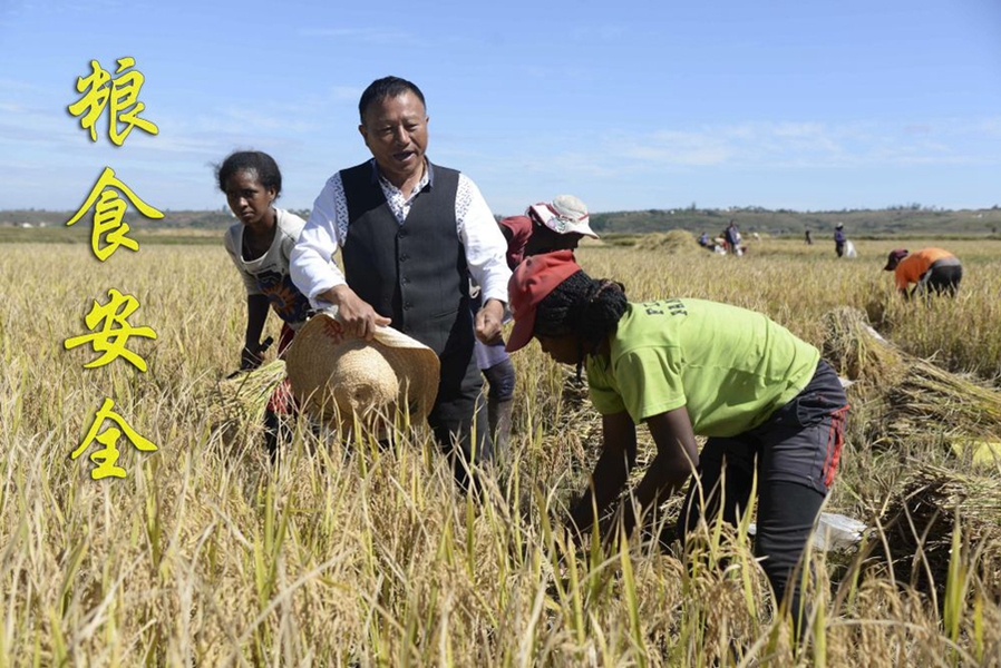 在马达加斯加首都塔那那利佛附近的马义奇镇,中国杂交水稻技术专家胡月舫(左二)在中国国家杂交水稻工程技术研究中心非洲分中心的试验田里和当地农民交流(2023年5月12日摄)。目前,中国杂交水稻在马达加斯加累计推广面积已达5万多公顷,平均每公顷产量可达7.5吨左右。马达加斯加距离实现粮食自给自足的目标迈近了一大步。