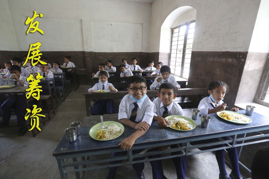 在尼泊尔加德满都,学生们参加微笑儿童项目启动仪式并就餐(2022年7月11日摄)。由“全球发展和南南合作基金”支持的微笑儿童项目惠及约3600名尼泊尔学生,解决学生就餐问题。
