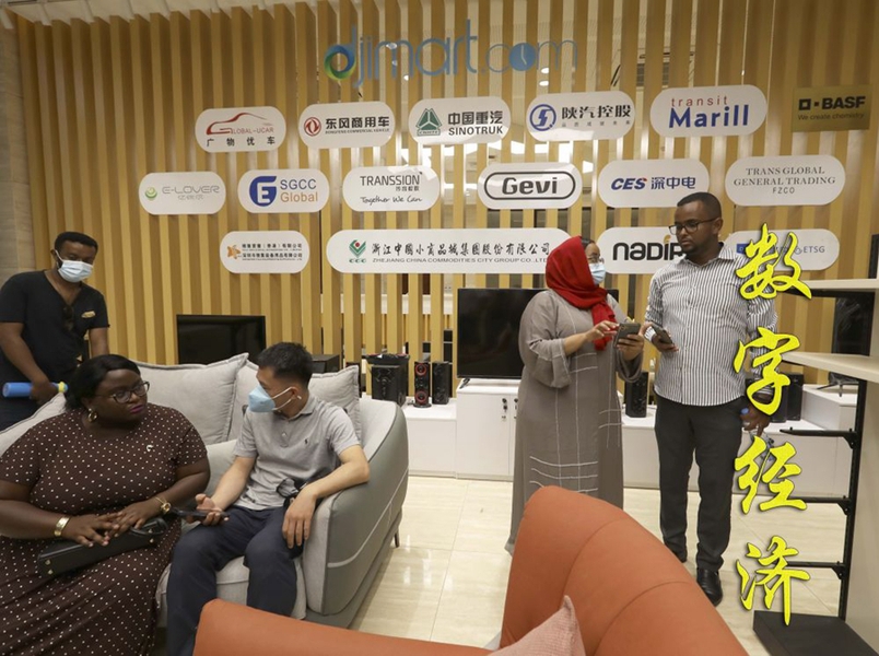 乌干达青年企业家迪莉娅(前左)在吉布提国际自贸区跨境电商平台展示区与中方人员交流(2022年9月14日摄)。