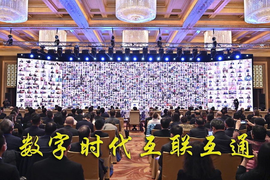在北京举行的世界数字教育大会上,全球万名师生云合奏合唱(2023年2月13日摄)。世界数字教育大会以“数字变革与教育未来”为主题,超过130个国家和地区的代表参会。