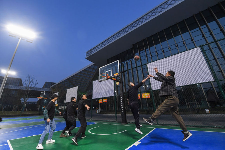 村民们在浙江省湖州市吴兴区织里镇文体中心的灯光球场打篮球(2022年1月18日摄)。新华社记者徐昱摄