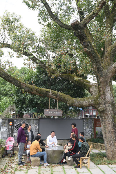 在浙江杭州市余杭区小古城村一株老樟树下,村民在商议乡村发展事项(2022年3月14日摄)。新华社记者翁忻旸摄