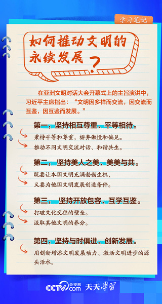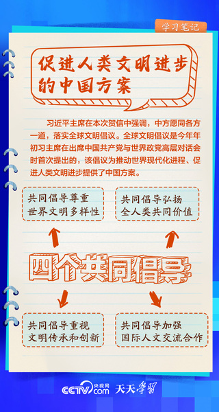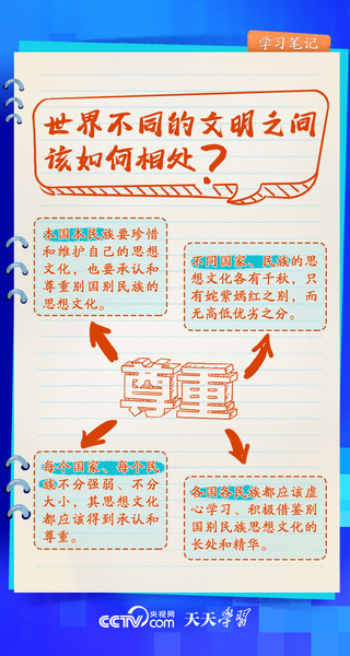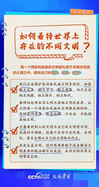 文明交流互鉴,是推动人类文明进步和世界和平发展的重要动力。从在联合国教科文组织总部等国际场合深刻阐释新时代中国的文明观,到亲自倡议举办亚洲文明对话大会,再到首次提出全球文明倡议……习近平主席在不同场合向世界阐述文明交流互鉴的意义,不断夯实构建人类命运共同体的人文基础。《天天学习·学习笔记》梳理总书记相关重要论述,与您一同学习。