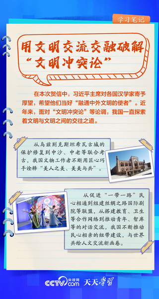 天天学习“不同文明之间平等交流、互学互鉴,将为人类破解时代难题、实现共同发展提供强大的精神指引。”2023年7月3日,习近平主席向第三届文明交流互鉴对话会暨首届世界汉学家大会致贺信。