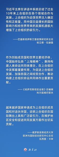 巴基斯坦伊斯兰堡政策研究所主任哈立德·拉赫曼说,习近平主席在讲话中系统总结了过去10年来上合组织在各个领域合作与发展。上合组织为动荡世界注入确定性和正能量,而中国日益增长的国际影响力和给世界带来的发展机遇极大增强了上合组织的吸引力。
