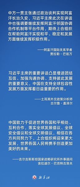 “过去20多年,我们为经常看到阿富汗人因战乱伤亡而悲伤。目前阿富汗安全形势依旧紧张,亟需国际社会的支持。”阿富汗国际关系学者贾拉勒·巴兹万百感交集。他说,中方一贯主张通过政治谈判实现阿富汗长治久安,习近平主席此次在讲话中也强调要继续发挥阿富汗邻国协调合作机制等平台作用,“期待上合组织在帮助阿富汗实现和平、稳定和发展方面继续发挥积极作用”。