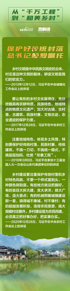 早在二十年前,时任浙江省委书记的习近平就在浙江省“千万工程”启动会上强调,要正确处理保护历史文化与村庄建设的关系,对有价值的古村落、古民居和山水风光进行保护、整治和科学合理地开发利用,切实保护好名人故居、古代建筑和历史文化遗迹,做到传承历史文化与融入现代文明的有机统一。