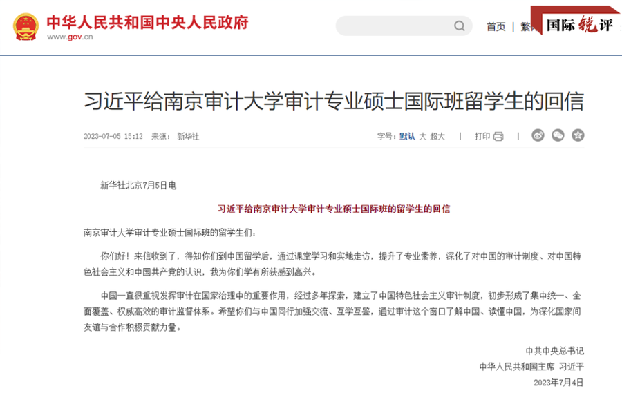 就在前一天,中国国家主席习近平给这个硕士国际班的留学生回信,鼓励他们与中国同行加强交流、互学互鉴,通过审计这个窗口了解中国、读懂中国,为深化国家间友谊与合作积极贡献力量。这封回信让吴娜班上的37位学生非常振奋。