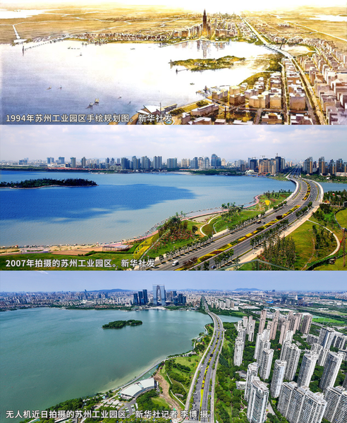 从城市规划、政府精简高效,到社会保障、环境保护……园区在全面对外开放的同时,精心编制符合中国国情、体现改革方向、具有自主特色的上百项法规性“管理办法”,与国际接轨的经济社会运作机制沿用至今。园区展览馆内,一张出自当年总规划师之手的手绘图和今天金鸡湖畔的实景惊人相似,犹如梦想照进现实。