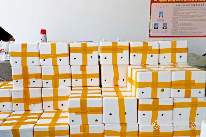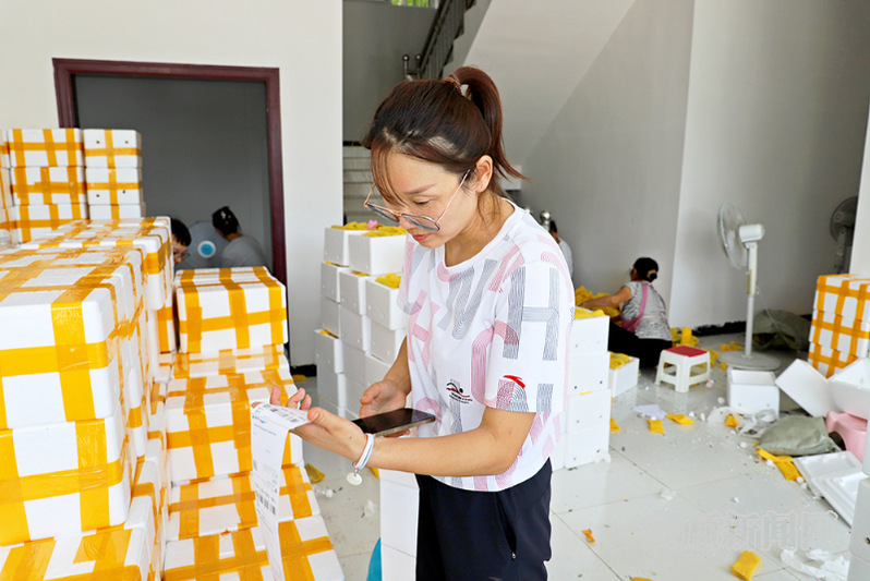 在乐安村村委,该村党总支部书记李诗仙正在认真核对快递单号,其他村干部将芒果装袋称重,装箱上车,大家各司其职,为助力果农销售芒果尽心竭力。