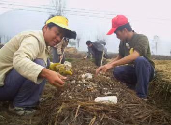 方洲(左一)在长顺志愿服务期间,和老百姓一起种菌丝