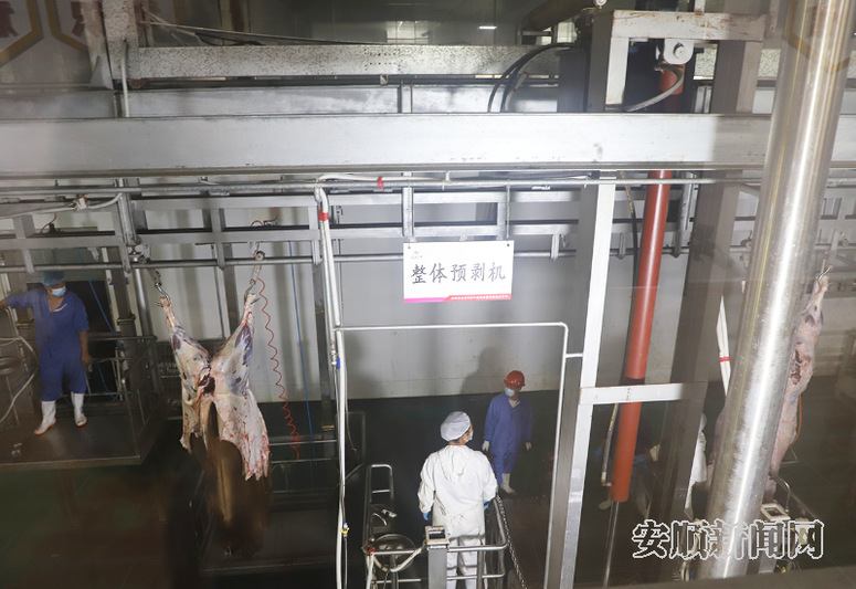 近日,记者来到位于关岭自治县龙潭街道办事处西龙村关岭牛产业园内的关岭自治县关岭牛产业园屠宰场,看见十余名“全副武装”的务工人员身着白色工作服、佩戴口罩,正在生产线上有序工作,生产线上一头头刚屠宰好的肉牛经过处理悬挂在车间顶部,通过自动脱毛机、整体预剥机等机械操作,经过分割肩肉、按大部位分体、剔骨、修割、打包装箱等程序,一头肉牛按照种类被快速分割成了通脊、肩肉、胸腩等各类牛肉产品。