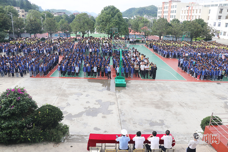 8月22日,是花江中学2023年秋季开学第一天,关岭自治县交警大队教导员、花江中学法治副校长叶檑参加学校开学仪式,为全校师生上交通安全知识课。