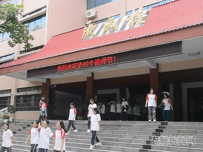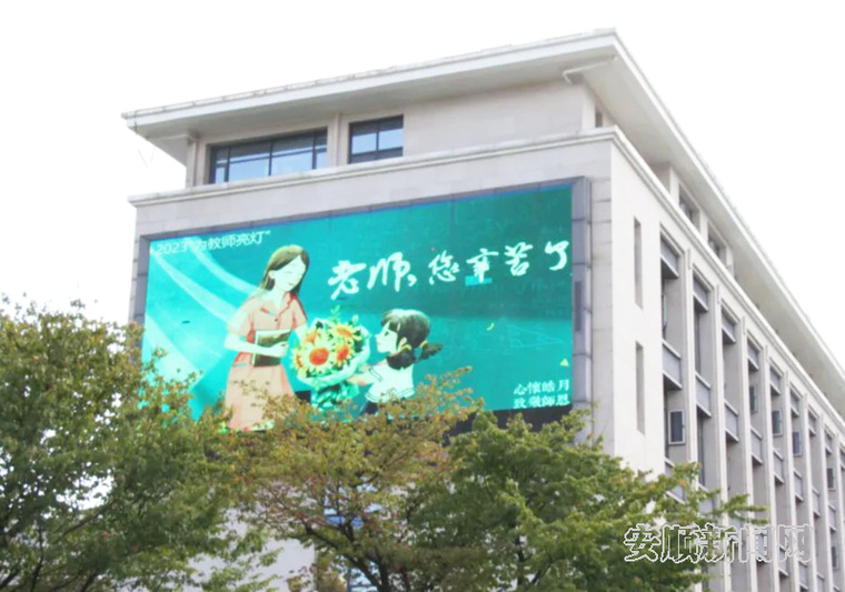 在安顺市第一高级中学教学楼前,电子屏滚动教师节祝福语。
