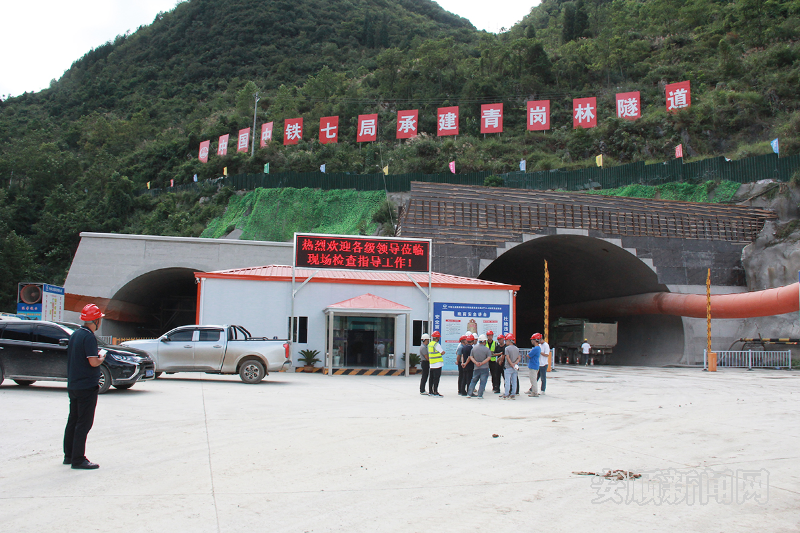 作为该标段控制性工程,也是安盘高速全线重点难点工程的青岗林隧道,全长2300多米。站在青岗林隧道出口前,可见隧道口的建设已具雏形,在灯光照耀下,可见远处工业机械作业的身影。