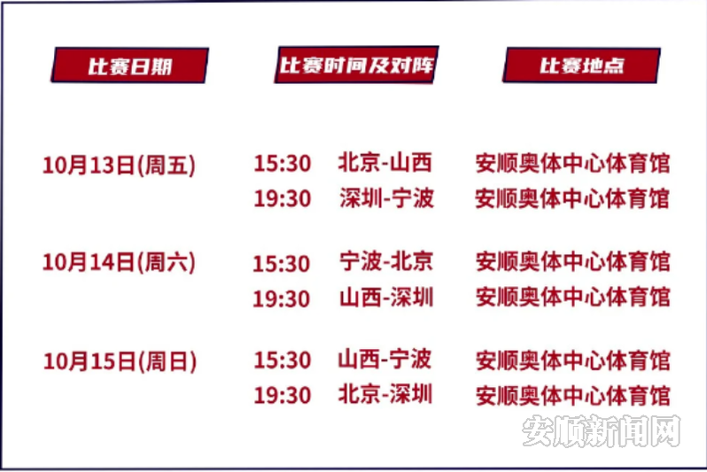 据安顺市体育场馆管理中心消息,2023年10月13日至10月15日,2023 CBA联赛季前赛(安顺站)将在安顺奥体中心体育馆开赛。北京北汽、宁波町渥、山西汾酒、深圳马可波罗四支球队将齐聚安顺为大家带来精彩对决,其中三支队伍在2022——2023年CBA联赛排名前十。当前售票通道已开通,可通过大麦网购买。