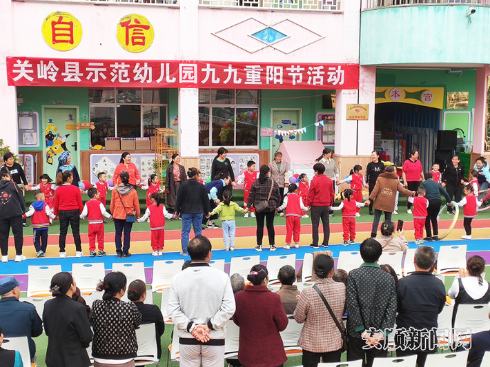在关岭示范幼儿园,老师们在向孩子们介绍了“重阳节”传统习俗后,让孩子们用特别的方式表达对爷爷、奶奶等家中老人的关心和爱护。有的孩子现场为老人捶背捏肩、有的孩子给长辈献花,还有的为老人展演了精心编排的歌舞。