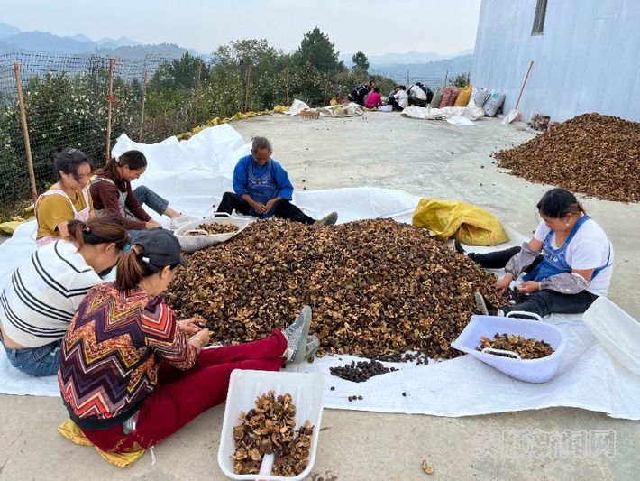 近日,记者在紫云自治县猫营镇黄鹤营村鸿发油茶种植基地加工厂房看到,厂房前后都晾晒着油茶果,村民们围坐在一起,给油茶果剥壳。