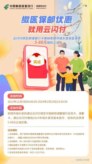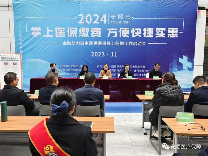 为全力推动我市2024年城乡居民医保参保工作,安顺市医疗保障局、安顺市税务局、人民银行安顺分行联合组织金融机构,就开展2024年度城乡居民医保参保缴费优惠活动进行多次沟通商议,印发《安顺市医疗保障局 国家税务总局安顺市税务局 人民银行安顺分行关于开展2024年安顺市“掌上医保缴费,方便快捷实惠”金融助力城乡居民医保线上征缴工作活动方案》。2023年11月15日上午,“掌上医保缴费,方便快捷实惠”金融助力城乡居民医保线上征缴活动在西秀区西街办事处互助社区顺利启动。银联、工行安顺分行、建行安顺分行、邮政银行、贵州银行、安顺农商行等商业银行及百余名社区居民参加。安顺市医疗保障局、安顺市税务局、人民银行安顺分行及贵州省联社安顺市审计中心相关领导出席活动。
