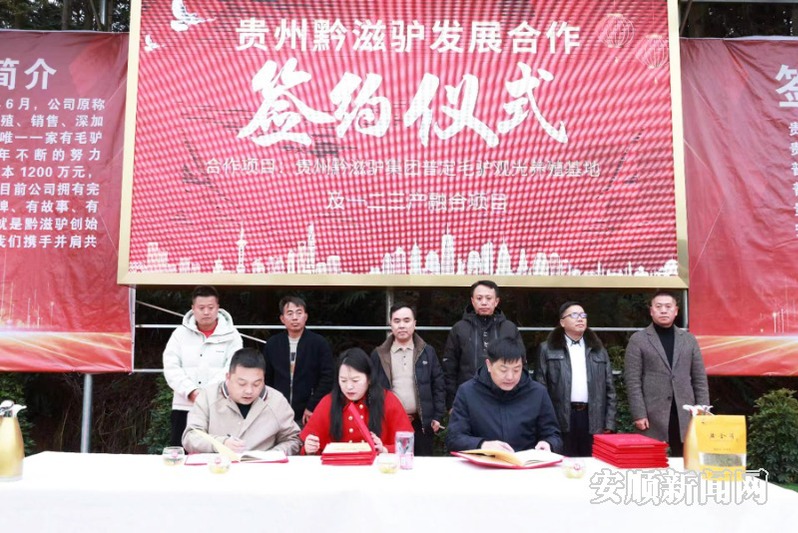 12月17日,贵州省“黔滋驴”餐饮集团有限公司进驻安顺,在普定万树居农业发展有限公司的万树居山庄与安顺青年企业家商会、安顺投资促进会的多家企业举行一二三产业融合发展项目签约仪式。