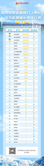 2023年第四季度,省交通运输厅、黔南州政府、紫云县政府分别获得省直部门(单位)、市(州)政府、县级政府排行榜第一名;省文化和旅游厅、六盘水市政府、都匀市政府分别获得第二名;省市场监管局、安顺市政府、息烽县政府分别获得第三名。 看看,你喜欢的新媒体开设单位本季度点亮了几颗星?贵州省政务新媒体运维排行榜(2023年第四季度)