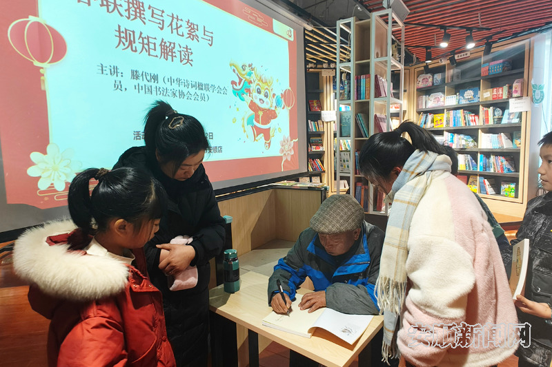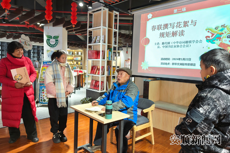 1月22日,安顺市新华书店内洋溢着浓厚的文化氛围。安顺书香集市活动在此举行“春联撰写花絮与规矩解读”讲座。此次活动由市图书馆、安顺市新华书店有限公司、贵州省统战部党外知识分子、统战工作实践创新基地晓宅书吧联合主办。