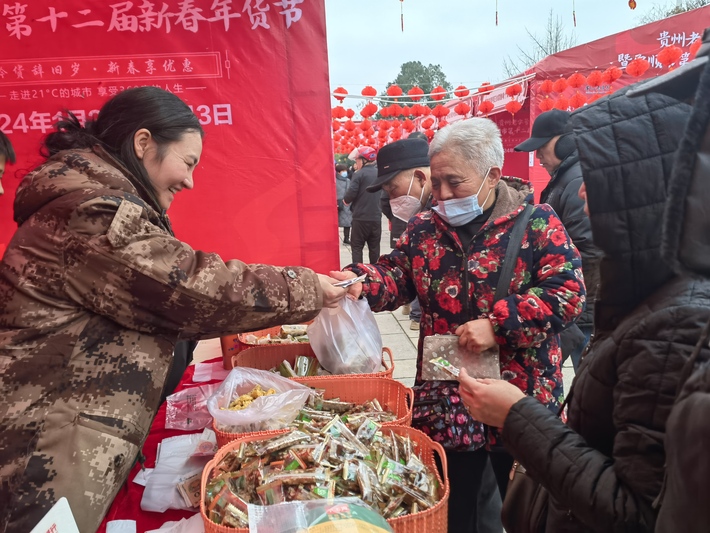 走进年货节现场,大红灯笼高挂、龙年造型景观吸引市民打卡拍照,焕然一新的美陈造景,将年味体现得淋漓尽致。各个摊位上,摆满了腊肉、八宝饭、梅菜扣肉、刺梨汁等各种黔味“土味”十足的年货,特产好物应有尽有,涵盖了零食干果、酒水茶叶、年俗用品、粮油副食、家庭生活等各类年货好物,满足了群众“一站式”购物需求,市民群众穿梭其间,纷纷“扫码”,不一会儿,手中大包小袋,满载而归。