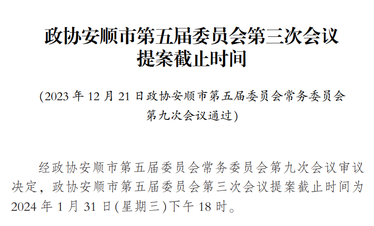 政协安顺市第五届委员会第三次会议提案截止时间公布
