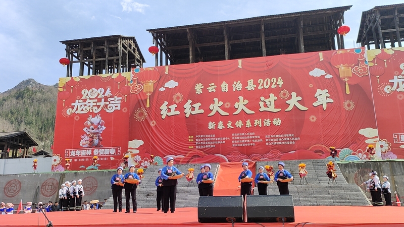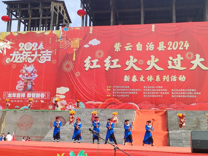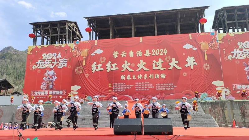 2月12日,紫云自治县“红红火火过大年”新春文体活动之苗族“跳花节”暨非遗展演在格凸河镇坝寨村举行。