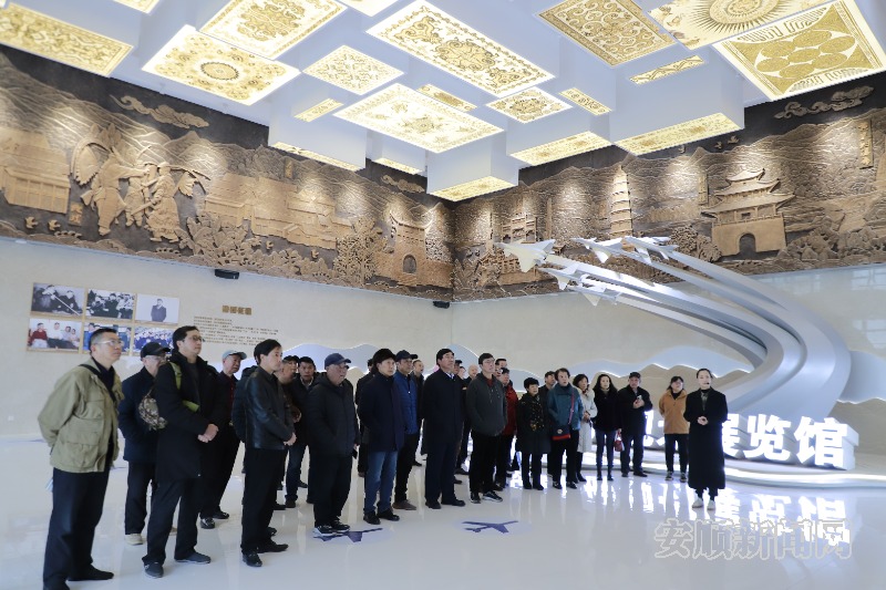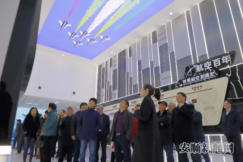 走进贵州航空产业城规划展览馆,老干部代表们认真观看视频短片和沙盘规划,认真倾听讲解员介绍,深入了解了安顺航空产业的历史,以及国家航空发展战略。贵州航空产业城规划展览馆在原安顺市城市规划展览馆的基础上进行改造,总占地面积2.67公顷(约40亩),总建筑面积27928㎡。展厅紧紧围绕“贵州航空产业城总体规划”及“军民融合 强国筑梦”为主题,突出安顺市航空产业的基础和发展优势,尤其是运用了创新的数字沙盘、投影、弧幕影院等数字展项,展现安顺市推动军民融合发展战略的探索实践和军民融合高技术成果。