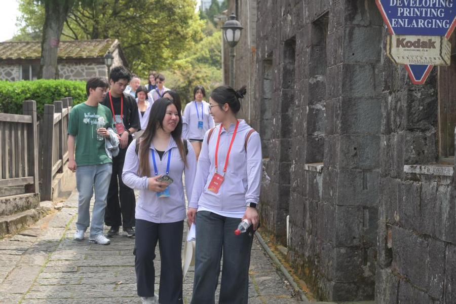3月25日,福州大学外国语学院学生(前右)与美国太平洋大学学生(前左)在福州鼓岭老街漫步交流。当日,来自美国俄勒冈大学、布朗大学、奥斯威格高级中学等校的美国学生与福州大学学生齐聚福州鼓岭,参加“读懂中国相约福建”友好交流活动。两国青少年走访鼓岭老街、万国公益社、柳杉王公园等,感受鼓岭百年中外交融历史风貌,了解中美交往往事,畅谈期待与希望,再续中美民间友好交往的“鼓岭故事”。新华社记者林善传摄