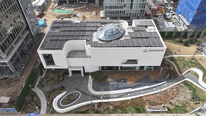 雄安自贸试验区交流展示中心(2024年3月28日摄,无人机照片)。该中心是首批通过新区专家评审的零碳示范建筑,具有自贸区规划及建设成果展示、企业文化品牌宣传、会议路演承办等多重功能。