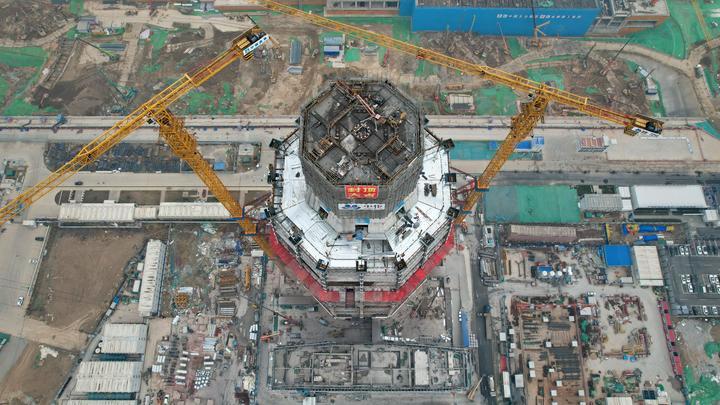 2024年3月27日拍摄的中国中化大厦建设现场(无人机照片)。这是河北雄安新区启动区标志性建筑之一,已实现核心筒主体结构封顶。中国中化大厦是首批疏解央企中国中化的总部大楼,设计结构高度150米。