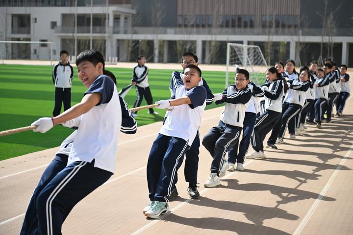 2024年3月29日,北京四中雄安校区学生在操场上拔河。