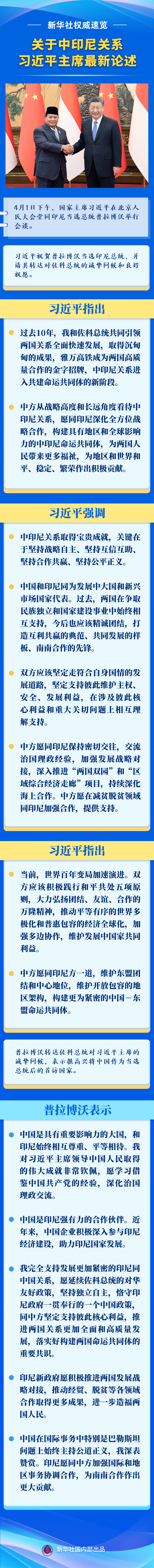 4月1日下午,国家主席习近平在北京人民大会堂同印尼当选总统普拉博沃举行会谈。一起来看会谈要点。