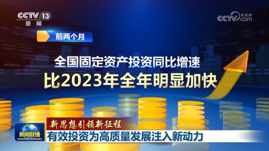 央视网消息(新闻联播):习近平总书记强调,要完善扩大投资机制,拓展有效投资空间。今年开年以来,服务高质量发展成为扩大有效投资的重要着力点,投资规模持续增长,投资结构质量持续提升,助力中国经济实现平稳开局。