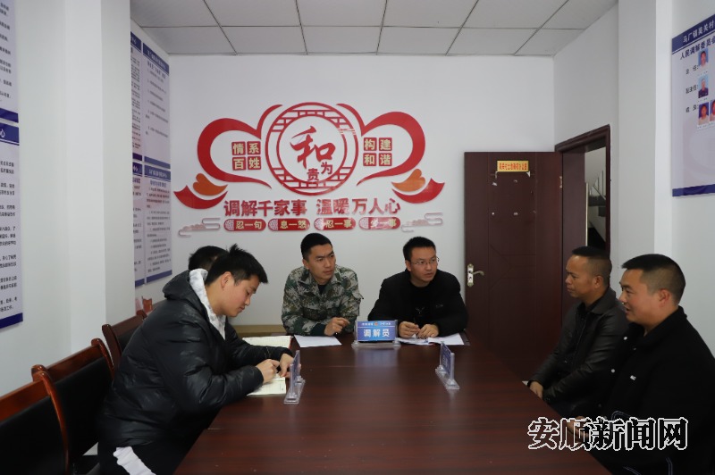 “姨妈,他们现在从镇宁回来了,大家一起去现场把这个事情调解好……。”吴关村村支书张鹏正联系纠纷双方到综治中心进行调解。