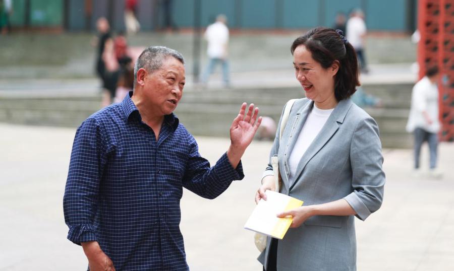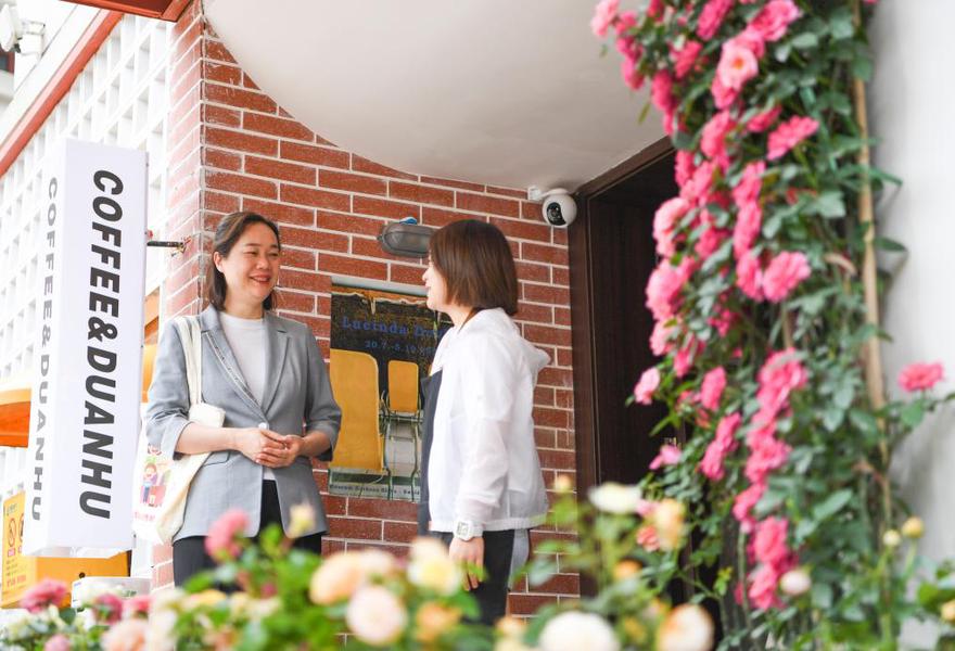 4月23日,伍成莉与社区内店铺工作人员交谈。