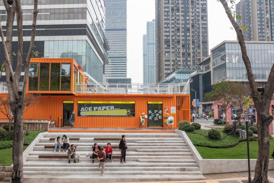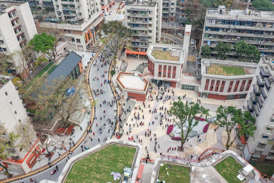 2023年4月28日,在竣工亮相的民主村片区城市更新项目(一期),人们在一处公共空间休息(无人机照片)。