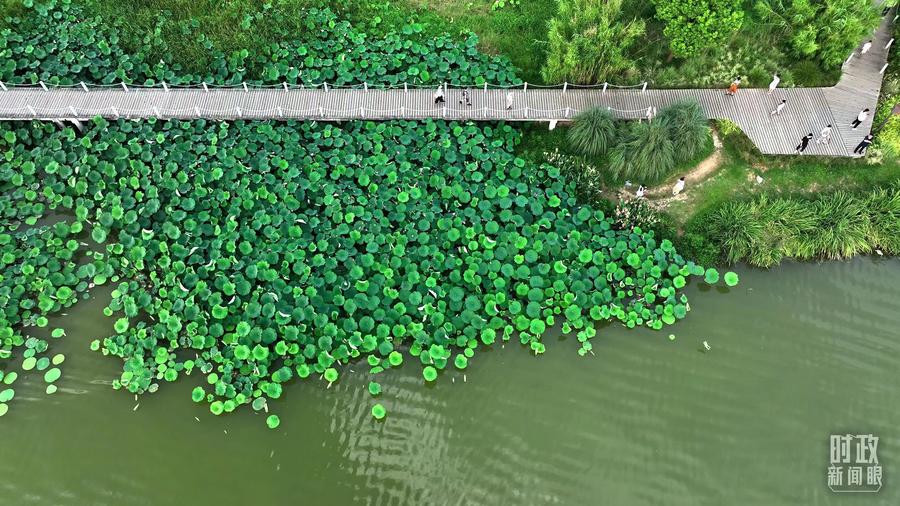 △陕西汉中天汉湿地公园内,游人穿行,荷影婆娑。(总台记者刘海涛拍摄)