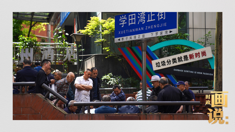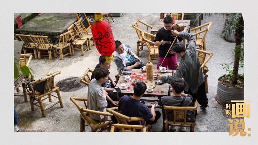 △山城巷的露天茶座中,传统川剧变脸演出引得茶客们连连叫好。