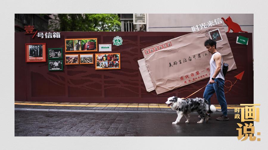 △小雨中,行人走过“重庆画卷”主题壁画。