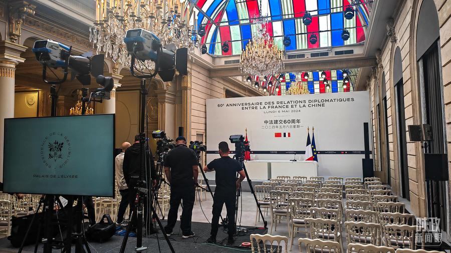 △习主席在巴黎爱丽舍宫同马克龙总统会谈后共同会见记者,这是会见开始前的现场。(总台央视记者刘琦拍摄)