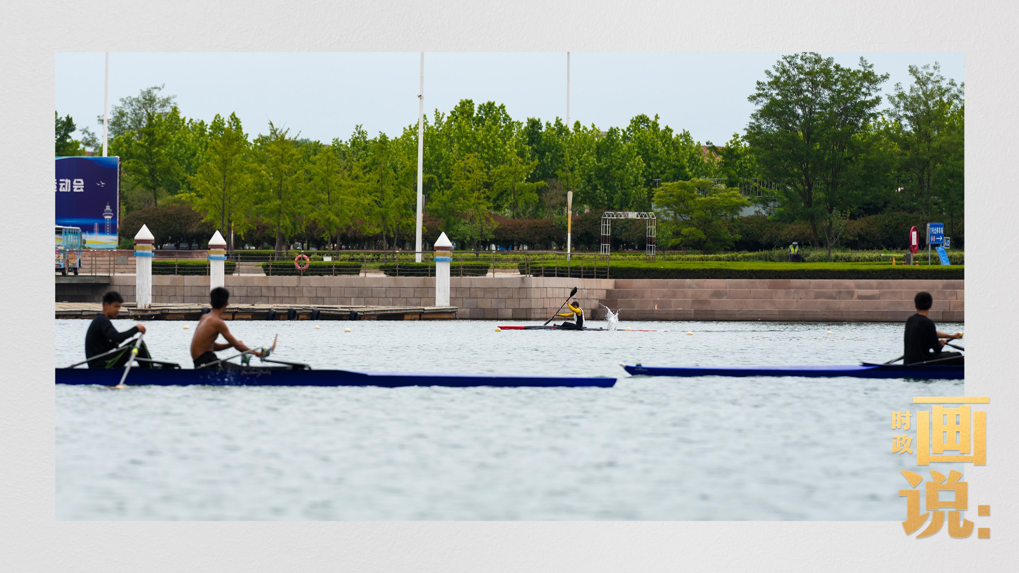△奥林匹克水上公园碧波轻漾,皮划艇运动员正在训练。