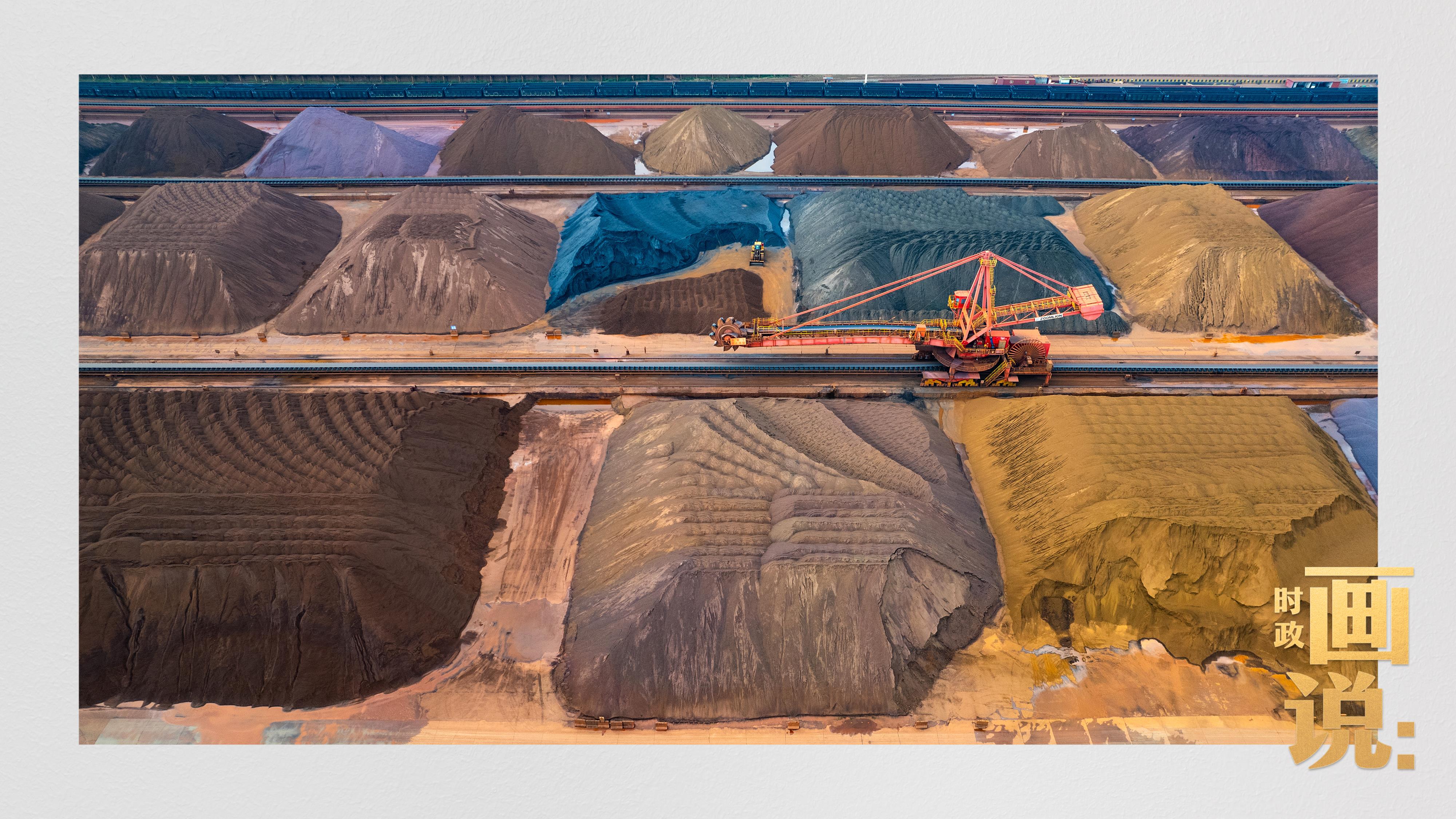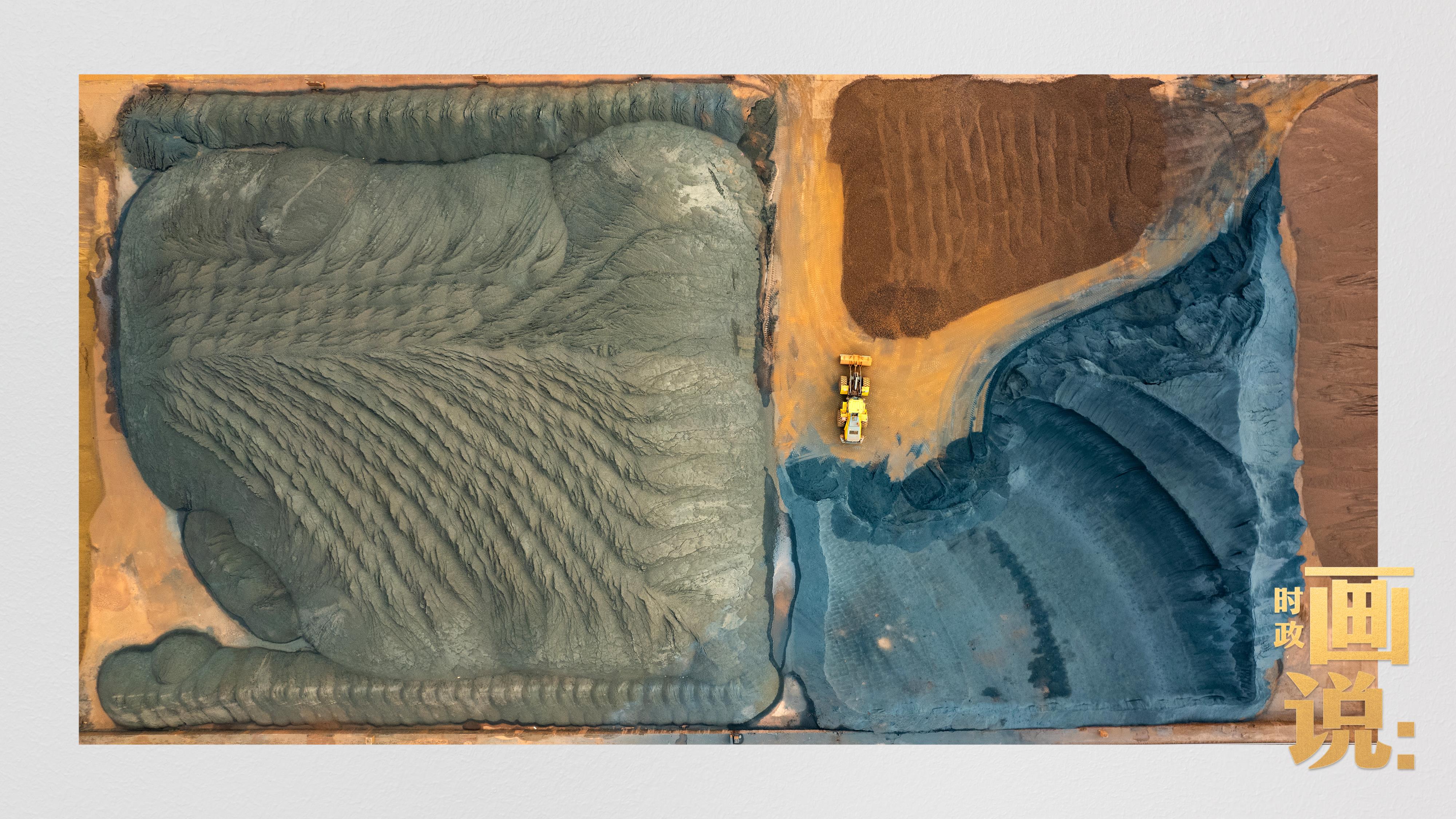 △港区内的矿石堆场整理堆放着五颜六色的各类矿石、矿砂,宛如油画。
